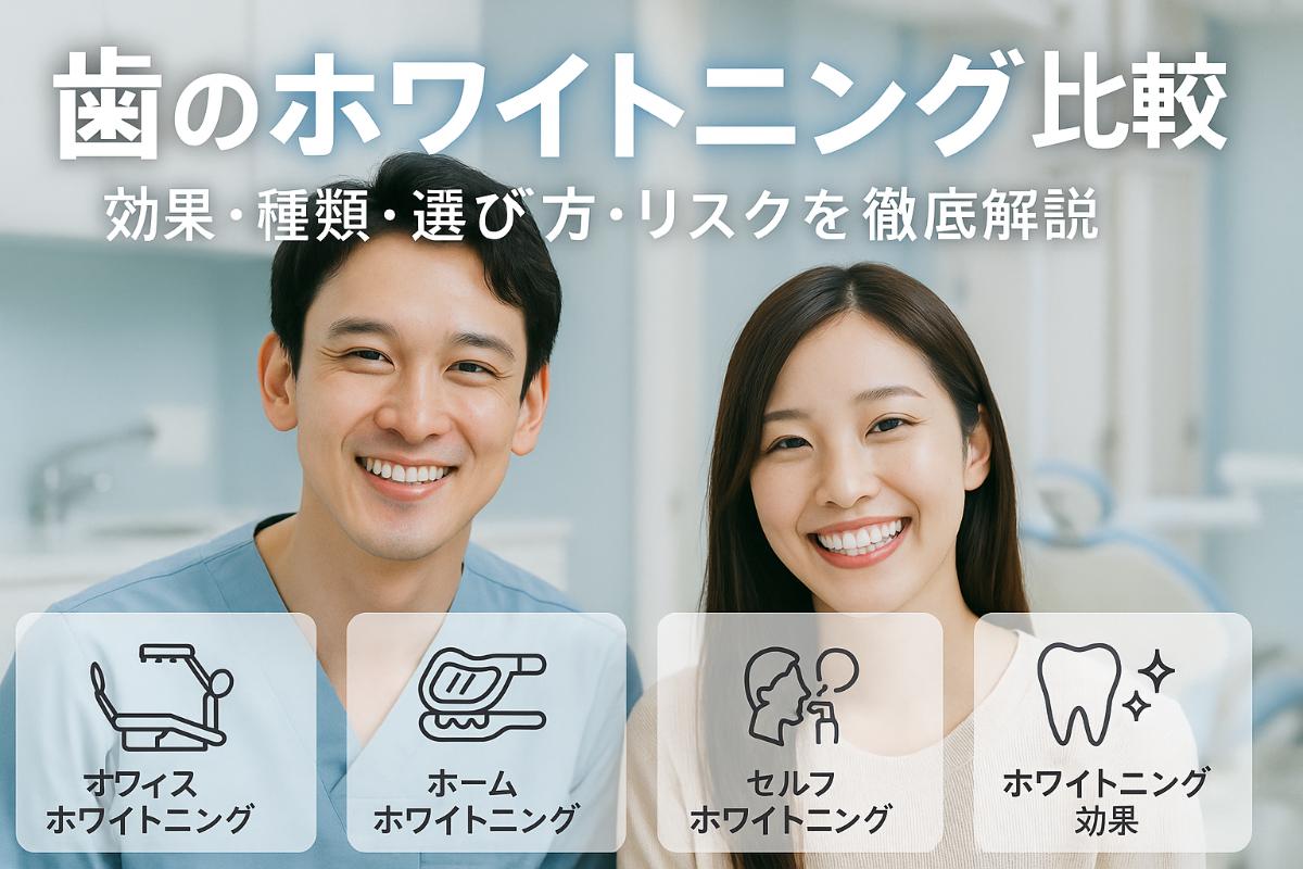 歯のホワイトニングは、歯の黄ばみや着色を取り除き、明るく健康的な印象を得られる人気の審美治療です。ホワイトニングには大きく分けて「オフィスホワイトニング」「ホームホワイトニング」「セルフホワイトニング(市販製品を含む)」の3種類があり、それぞれ効果・費用・持続期間・リスクに違いがあります。